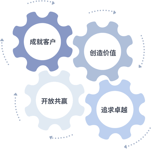 成就客户是一切决策的出发点,,,,创造价值是衡量所有工作的标准,,追求卓越是我们做事做人的态度,,,开放共赢是我们的格局也是最终的结果。。。。价值观的齿轮环环相扣,,推动着组织里的每个人不断向前。。